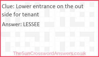 Tenant Crossword Clue Answers, Crossword Solver Oct 10, 2022 · This crossword clue Tenant was discovered last seen in the October 10 2022 at the Puzzle Page Crossword. The crossword clue possible answer is available in 6 letters. This answers first letter of which starts with L and can be found at the end of E. We think LESSEE is the possible answer on this clue. Crossword clues for Tenant TENANT crossword clue - All synonyms & answers Thanks for visiting The Crossword Solver "TENANT". We've listed any clues from our database that match your search for "TENANT". There will also be a list of synonyms for your answer. The synonyms and answers have been arranged depending on the number of characters so that they're easy to find. If a particular answer is generating a lot of interest on the site today, it may be highlighted in orange.