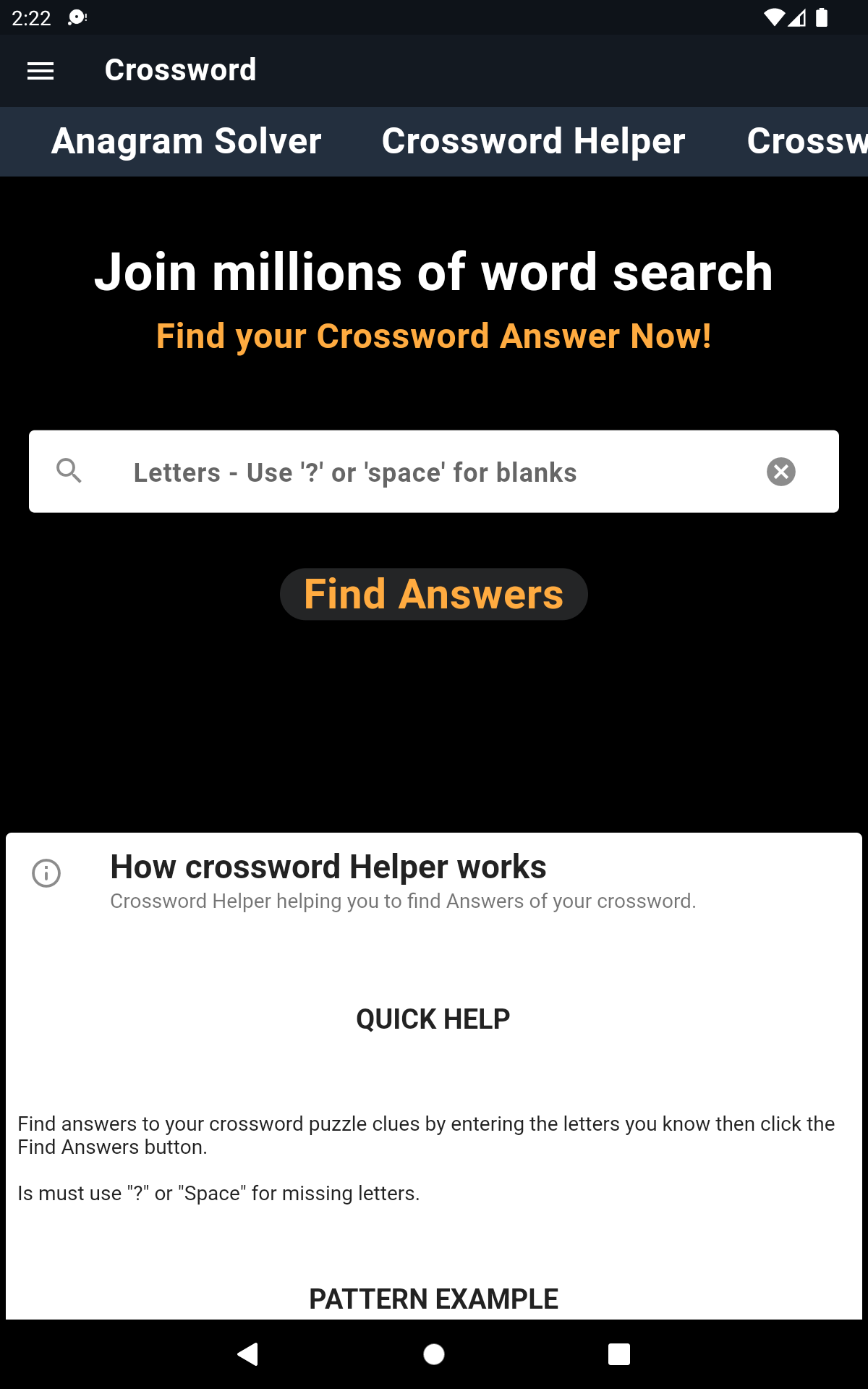 Anagram Solver with Wildcards - We Make You Smarter - Hanging Hyena This word solver can find anagrams very efficiently using pattern matching technology. The anagram builder spins through the possible combinations of letters to find full (anagram words that use all of the letters) and partial anagrams (word anagram using only some of the letters letters you provide it). Crossword Solver - find missing letters, synonyms, anagrams ... Crossword Solver - find missing letters, synonyms, anagrams with our crossword help Search for a clue, word or if you have missing letters use a question mark (?) or dot (.) in place of any letters you don't know (e.g. "cr???wo?d") Search Crossword Solver Search by length Check for Missing links Crossword Solver Anagram Solver - solves any anagram! Free Online Anagram Solver. Get Anagram Solver. on your iPhone. Try our. Crossword Solver. Anagram to solve: Anagram Solver, Anagram Maker, Scrabble Solver | Wordplays.com HOW TO USE THE ANAGRAM SOLVER The free online Anagram Solver will find one word anagrams and Scrabble anagrams using your letters. Enter your letters above and click the search button to make anagrams. Use the Anagram Generator to create anagrams by rearranging letters in a name, word or phrase to make a new word or phrase.