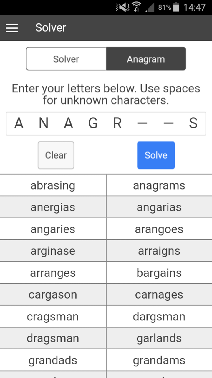 Anagram Solver and Anagram Generator | Wordfind - Scrabble Word Finder An anagram solver is an online tool that allows you to rearrange your letters to create various other words or phrases. The way it works is simple. All you need to do is input the letters or words, and the site will unscramble the words and give you the answer. It can give you several results and help you solve the anagram.